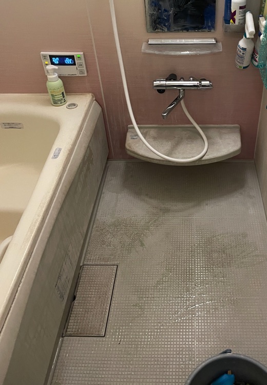 今回は在宅中のお客様のご依頼をいただきました。浴室床の水垢、黒ずみ清掃を実施しております。