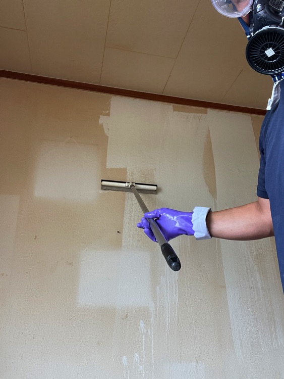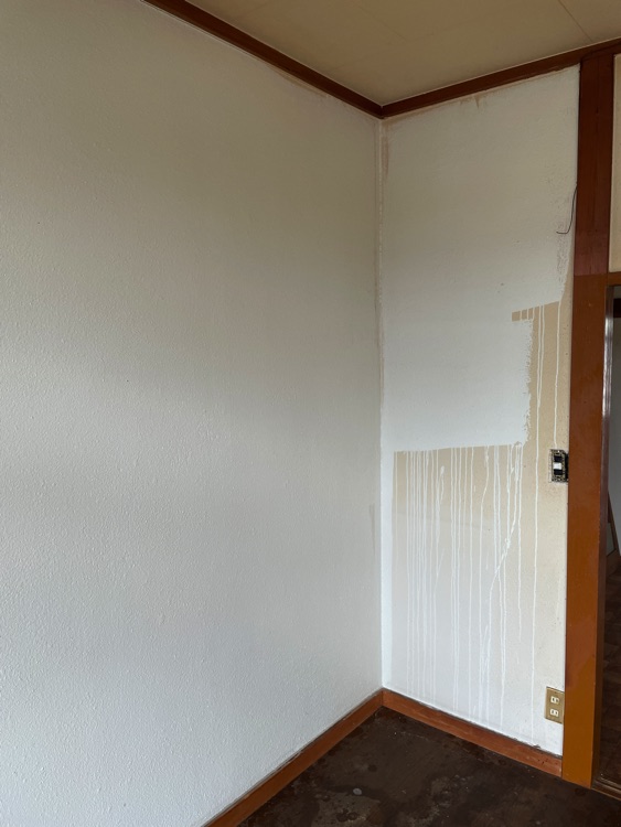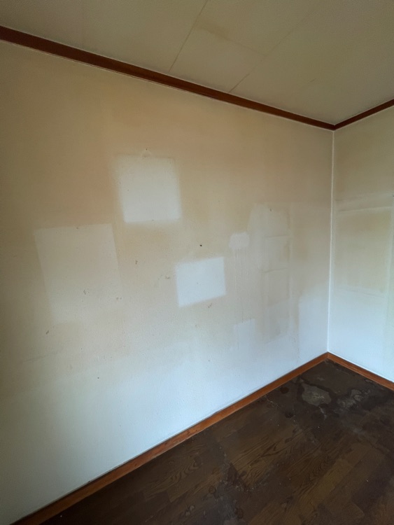 実績紹介その3 アパート洋室の天井、壁のたばこのヤニ汚れ落とし、室内消臭を実施しました。壁、天井は業務薬剤塗布で白さを取り戻しました。その後、プラズマオゾン脱臭機panther-Jにて室内消臭。 2025年12月 壁 Before After 作業中の様子